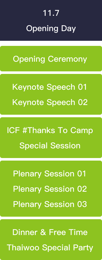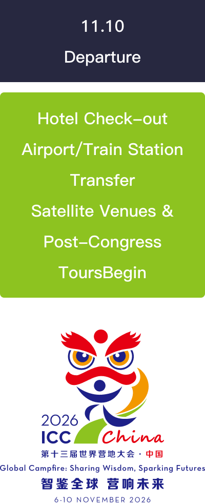 The main congress will take place from November 6 to 10, 2026, featuring a diverse range of activities including welcome ceremonies and grand openings to keynote speeches, plenary sessions, parallel workshops, evening cultural exchanges, networking dinners, signature parades, #ThankstoCamp Campaign, Women in Camp Summit, Youth Summit, ICF Friendship Corners, and ICF Awards—the Congress offers a diverse range of programs to facilitate deep interaction and multi-dimensional engagement. Together, these sessions will foster in-depth interaction, cross-cultural dialogue, and a truly enriching congress experience.